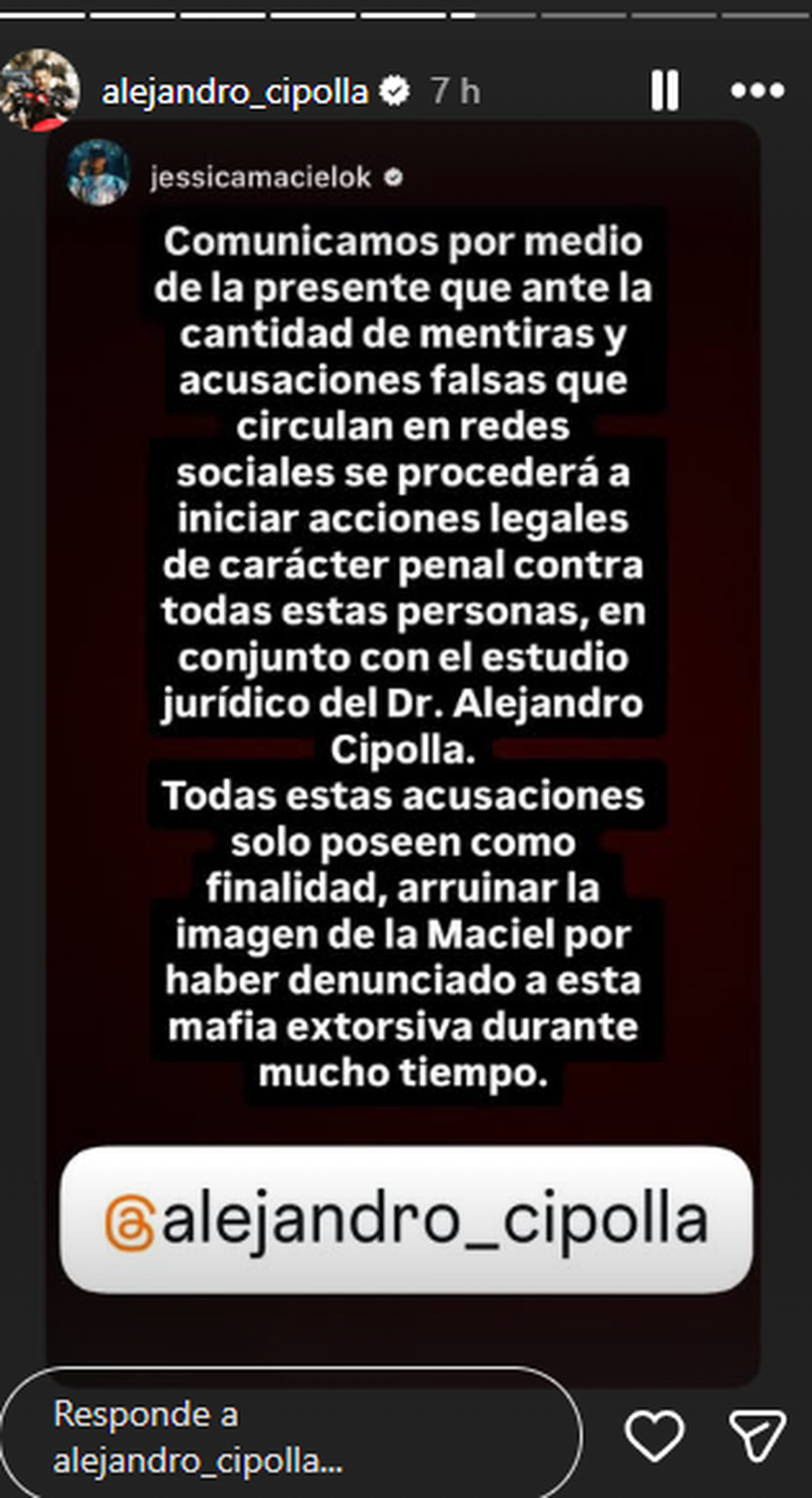 A partir de la difusión de estas declaraciones, desde el entorno de Jessica “La Maciel” salieron a rechazar las acusaciones y a plantear que se trataría de una operación en su contra. “Es mentira, es todo una operación. Una falsa denuncia”, aseguró Mariano, su pareja, según contó Pilar Smith.
