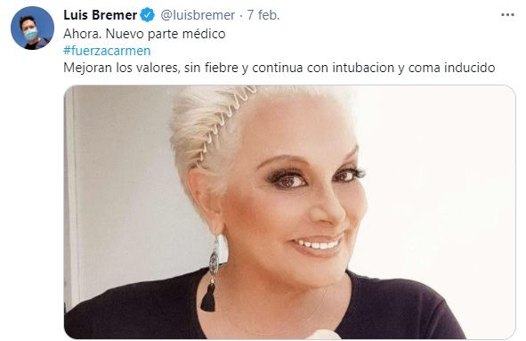 El sábado se conoció un audio que uno de los médicos que atiende a Carmen le envió al actor. "Mejoró un poquitito más la oxigenación y está sin fiebre. (…) Se va despertando razonablemente bien. Abre los ojos, parece entender órdenes bien”.