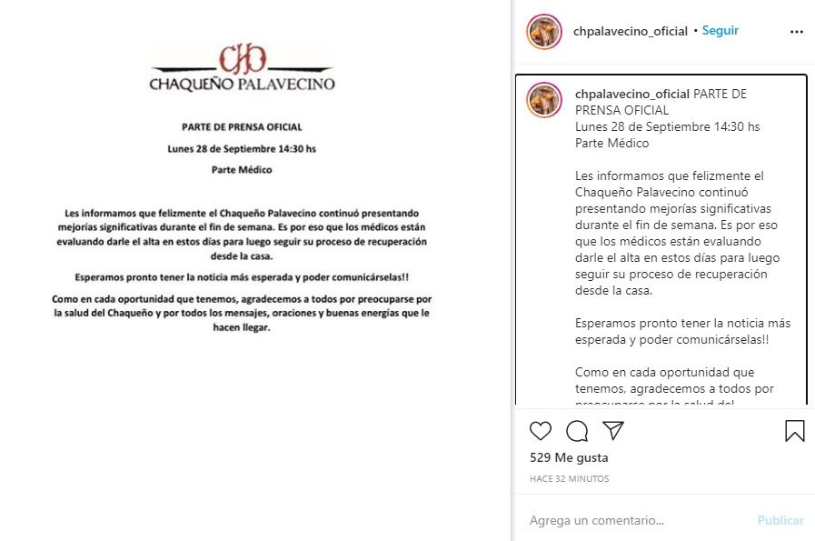 "Les informamos que felizmente el Chaqueño Palavecino continuó presentando mejorías significativas durante el fin de semana. Es por eso que los médicos están evaluando darle el alta en estos días para luego seguir su proceso de recuperación desde la casa", indicó el escrito que se difundió en las redes del cantante.