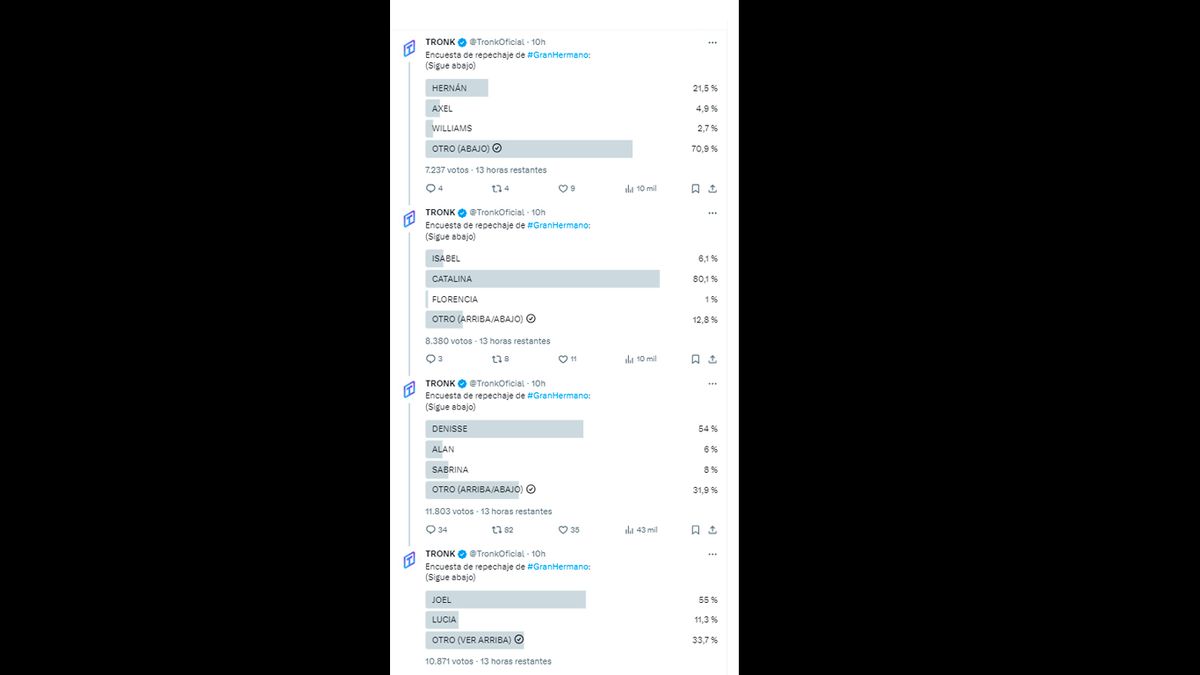 En Twitter, una encuesta se hizo popular entre los seguidores del reality y anticipa quiénes podrían ser los elegidos para reingresar a la casa. Hasta el momento, Catalina es la favorita, con el 80,1%, seguida por Joel, que tiene el 55%, y Denisse, que está muy cerca de él con el 54%.
