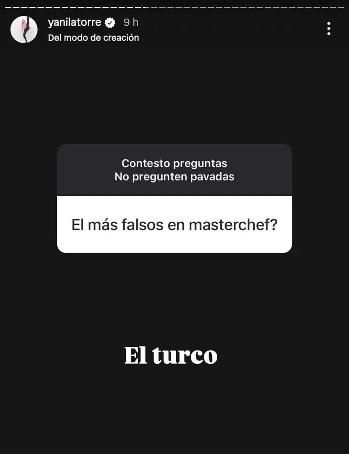 Así, respondiendo preguntas de sus seguidores sobre su experiencia en MasterChef Celebrity por medio de la ya famosa cajita de preguntas, Yanina cumplió su promesa de contar todos los secretos del programa. De este manera, ante la consulta de quién es "el más falso", Latorre no dudó en sentenciar: "El turco", así como también afirmó que es el más competitivo de todos los participantes.