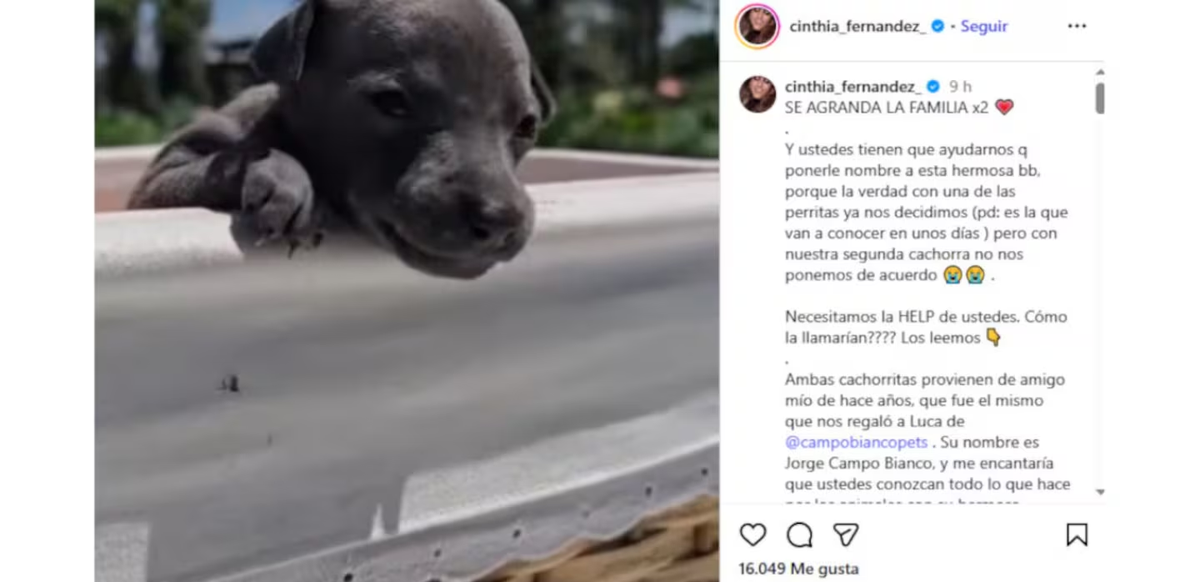 “Se agranda la familia x2″, escribió Cinthia en la publicación. A su vez, compartió un texto les hizo un pedido especial a sus seguidores para que la ayuden a elegir el nombre de la cachorrita.