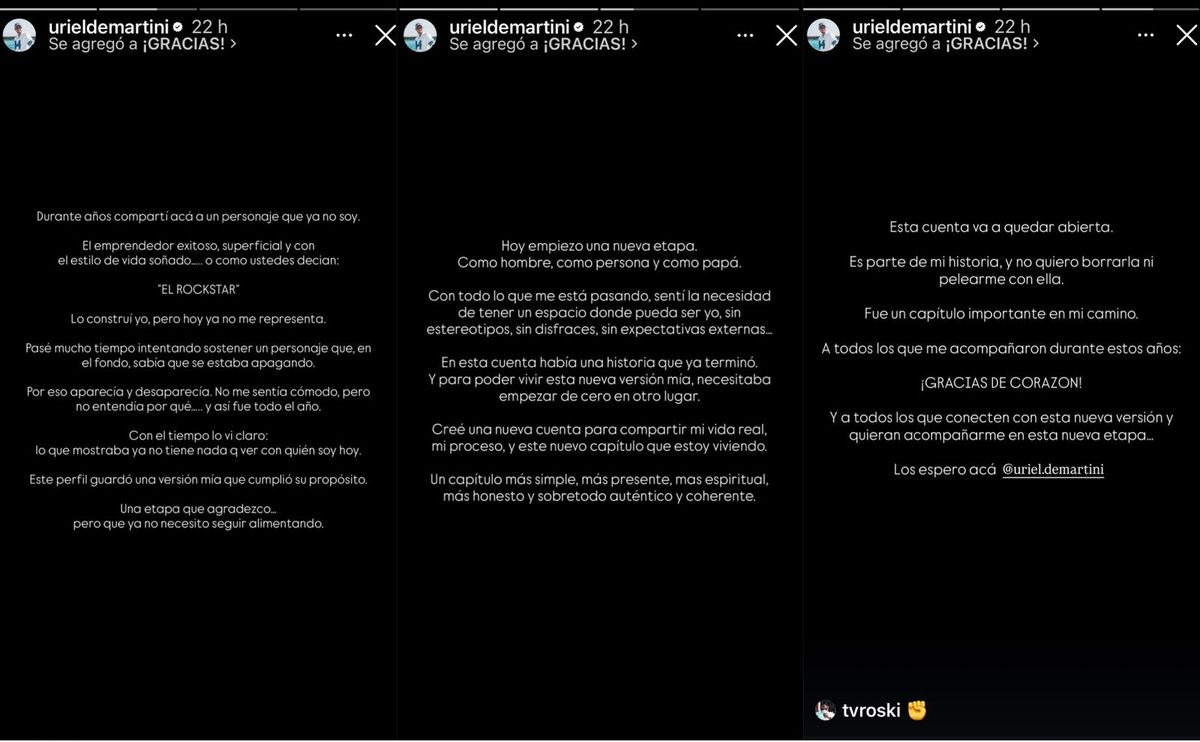 "Durante años compartí acá a un personaje que ya no soy. El emprendedor exitoso, superficial y con el estilo de vida soñado... o como ustedes decían: 'EL ROCKSTAR'. Lo construí yo, pero hoy ya no me representa. Pasé mucho tiempo intentando sostener un personaje que, en el fondo, sabía que se estaba apagando. Por eso aparecía y desaparecía", confió en el primer tramo del primero de sus posteos.
