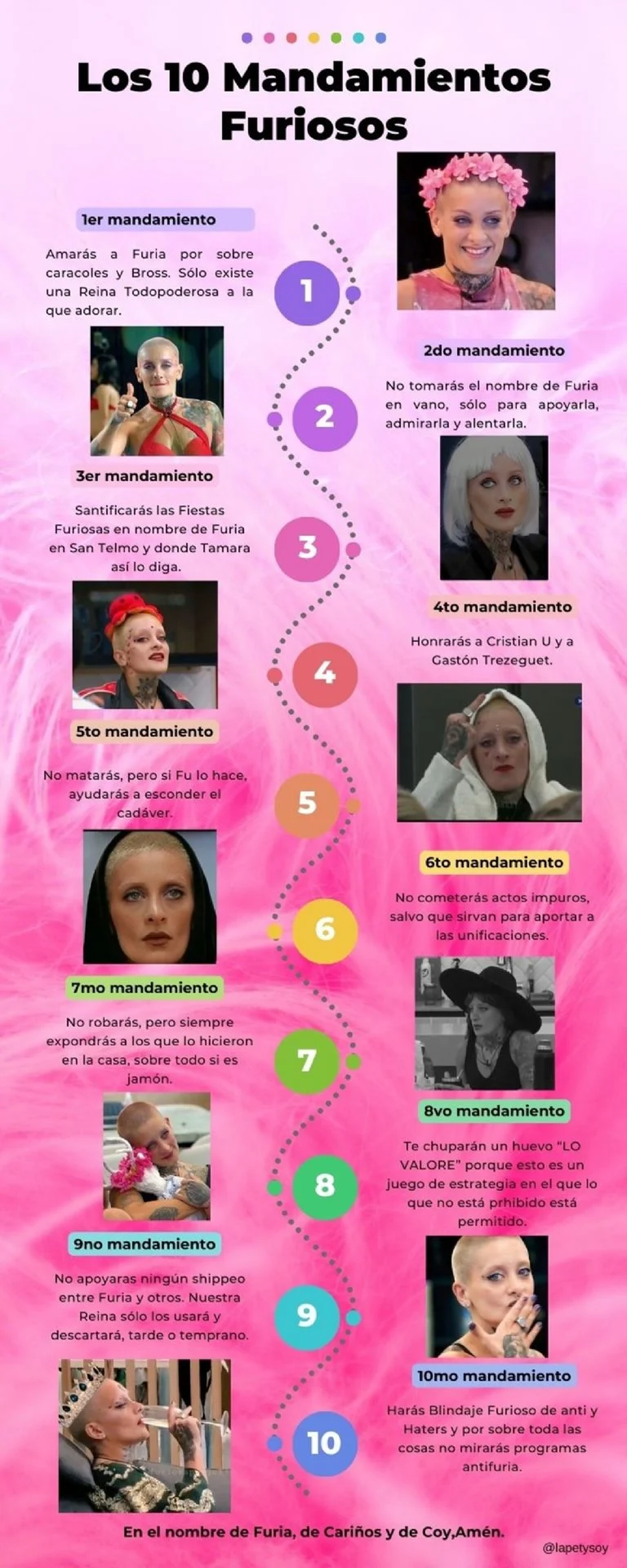 "Amarás a Furia por sobre los caracoles y Bros", "No tomarás el nombre de Furia en Vano", "Santificarás las fiestas Furiosas", "Honrarás a Cristian U. y a Gastón Trezeguet", "No matarás, pero si Furia lo hace, ayudarás a esconder el cadáver", "No cometerás actos impuros, salvo que sirva para aportar a las unificaciones", "No robarás, pero siempre expondrás a los que lo hicieron en la casa", "Le chuparán un hu... 'lo valore'", "No apoyarás ningún shippeo entre Furia y otros", "Harás blindaje Furioso de anti y haters", son las 10 reglas a cumplir para pertenecer al "clan".