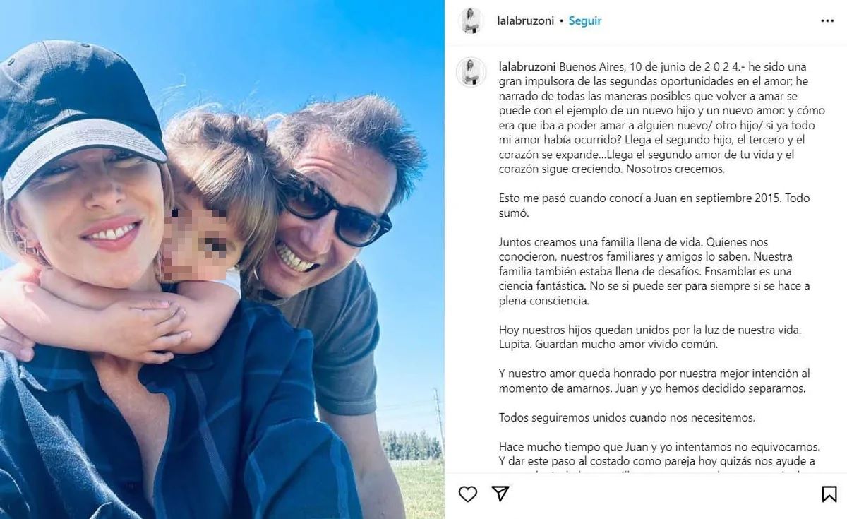 “Buenos Aires, 10 de junio de 2024. He sido una gran impulsora de las segundas oportunidades en el amor; he narrado de todas las maneras posibles que volver a amar se puede con el ejemplo de un nuevo hijo y un nuevo amor: ¿y cómo era que iba a poder amar a alguien nuevo/ otro hijo/ si ya todo mi amor había ocurrido? Llega el segundo hijo, el tercero y el corazón se expande...Llega el segundo amor de tu vida y el corazón sigue creciendo. Nosotros crecemos”, comenzó escribiendo Lala Bruzoni en su cuenta de Instagram al anunciar el final de su matrimonio con Juan Pablo Varsky.