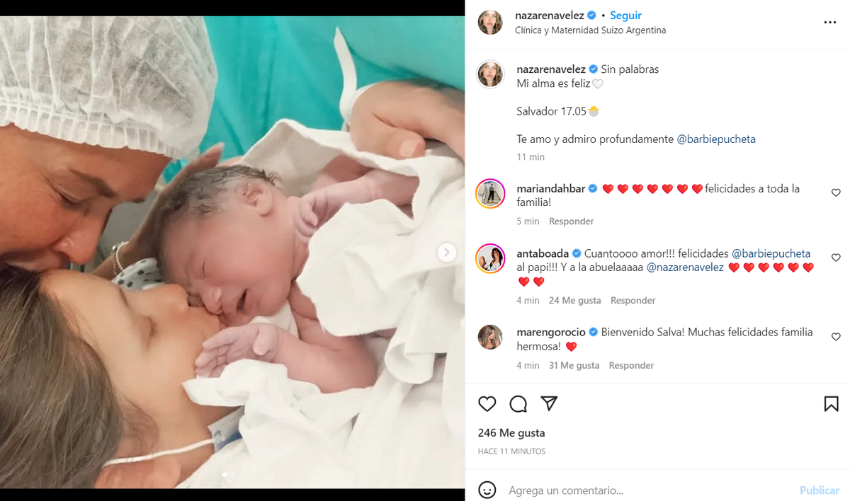 En sus redes, Nazarena subió la primera foto de Salvador en brazos de su mamá. "Sin palabras. Mi alma es feliz. Salvador 17.05. Te amo y admiro profundamente @barbiepucheta", expresó la ex vedette en el posteo.