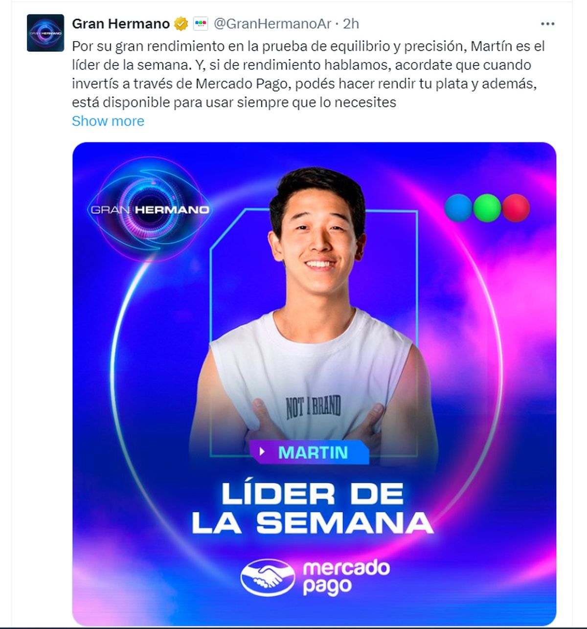 "Por su gran rendimiento en la prueba de equilibrio y precisión, Martín es el líder de la semana", publicó este martes la cuenta oficial de Gran Hermano en X.