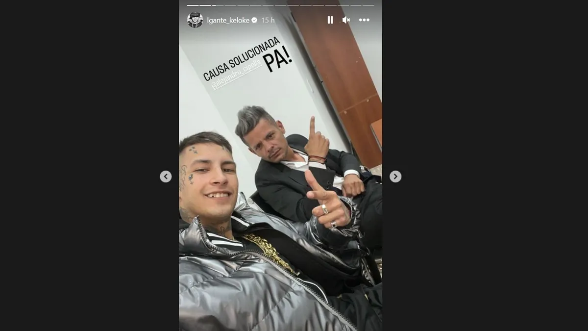 En este contexto, desde sus historias de Instagram, L-Gante celebró la resolución de un conflicto que tenía en el plano legal con una imagen junto a su abogado, Alejandro Cipolla. "Causa solucionada Pa!", expresó el artista.