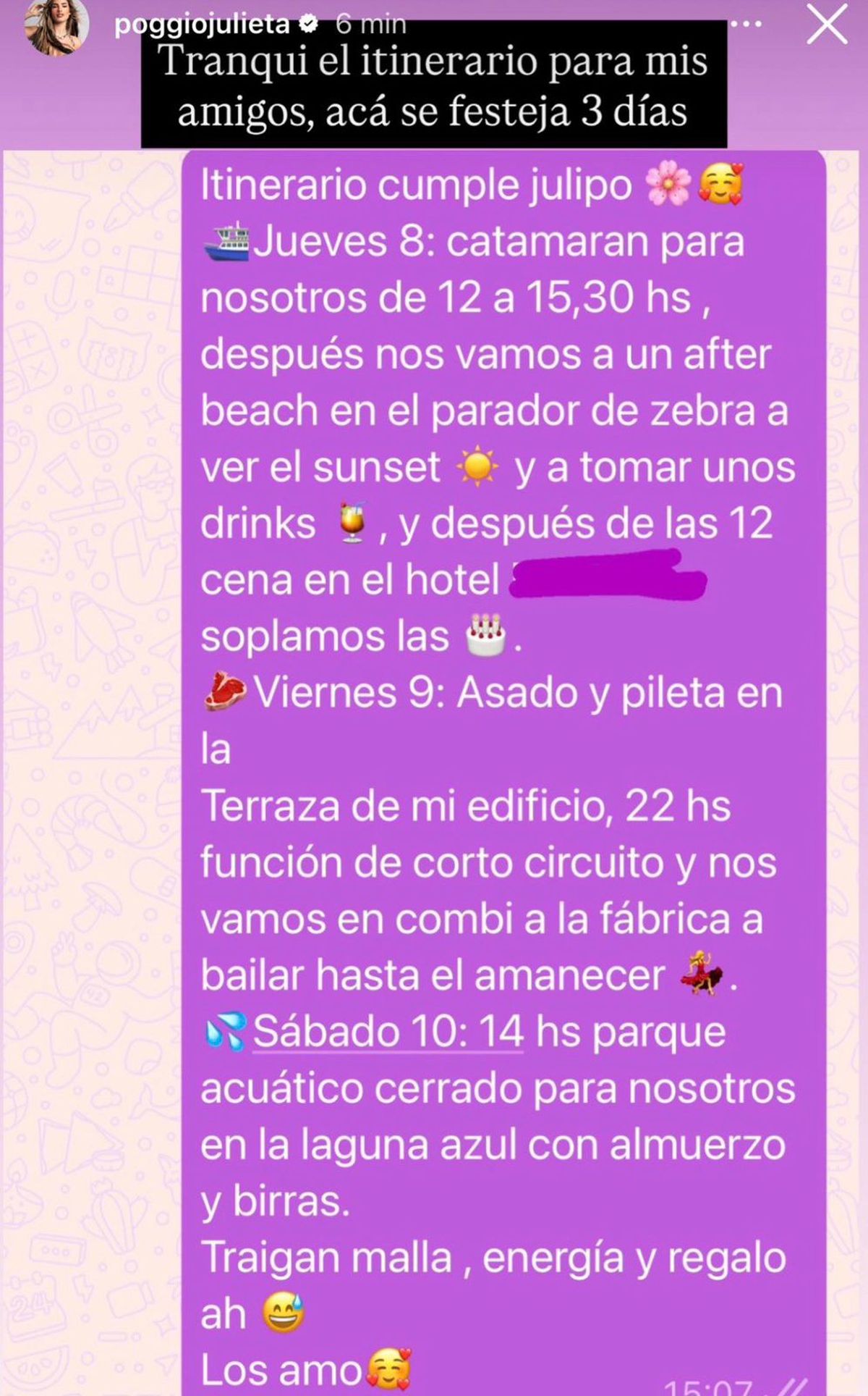 Todo salió a la luz cuando la propia Juli compartió en sus historias de Instagram una captura de un mensaje de WhatsApp enviado a sus invitados. El texto, lejos de ser informal, mostraba un cronograma detallado que dejó en claro que el festejo fue pensado al milímetro y sin escatimar en planes.
