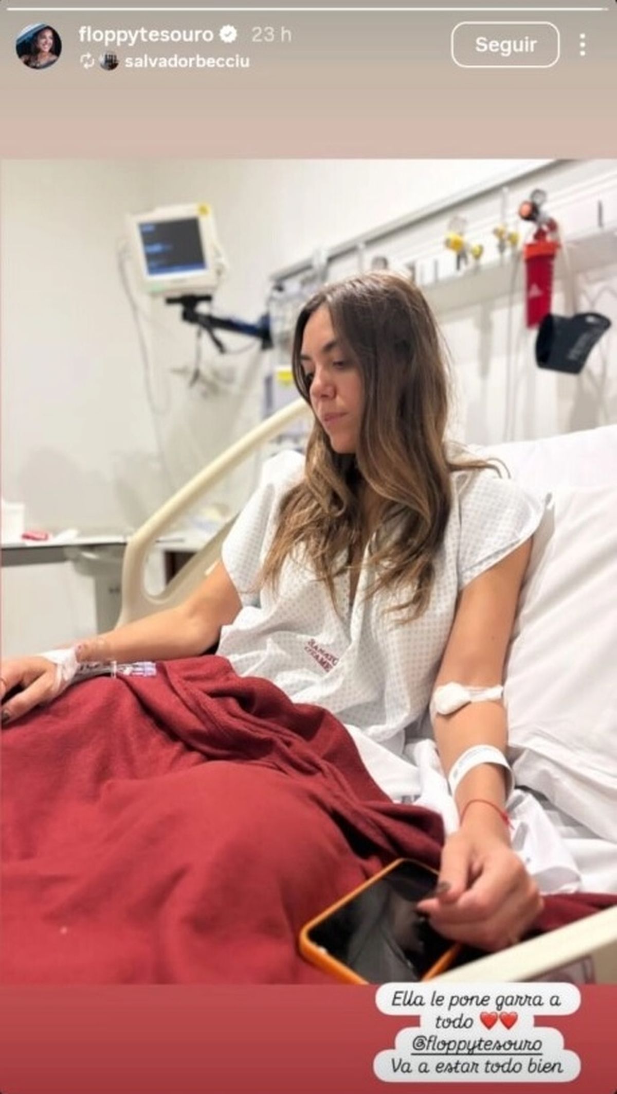 En la postal se observa a la modelo durante su internación, reflejando el momento que atraviesa tanto en lo físico como en lo emocional. Junto a la imagen, Salvador Becciu le dedicó unas palabras de aliento que no pasaron desapercibidas:“Ella le pone garra a todo corazón”, escribió, y sumó un mensaje cargado de optimismo para llevar tranquilidad: “Floppy va a estar todo bien”, menaje que fue bien recibido por la modelo quien no dudó en compartirlo en sus historias virtuales mientras espera la total recuperación para ser dada de alta.