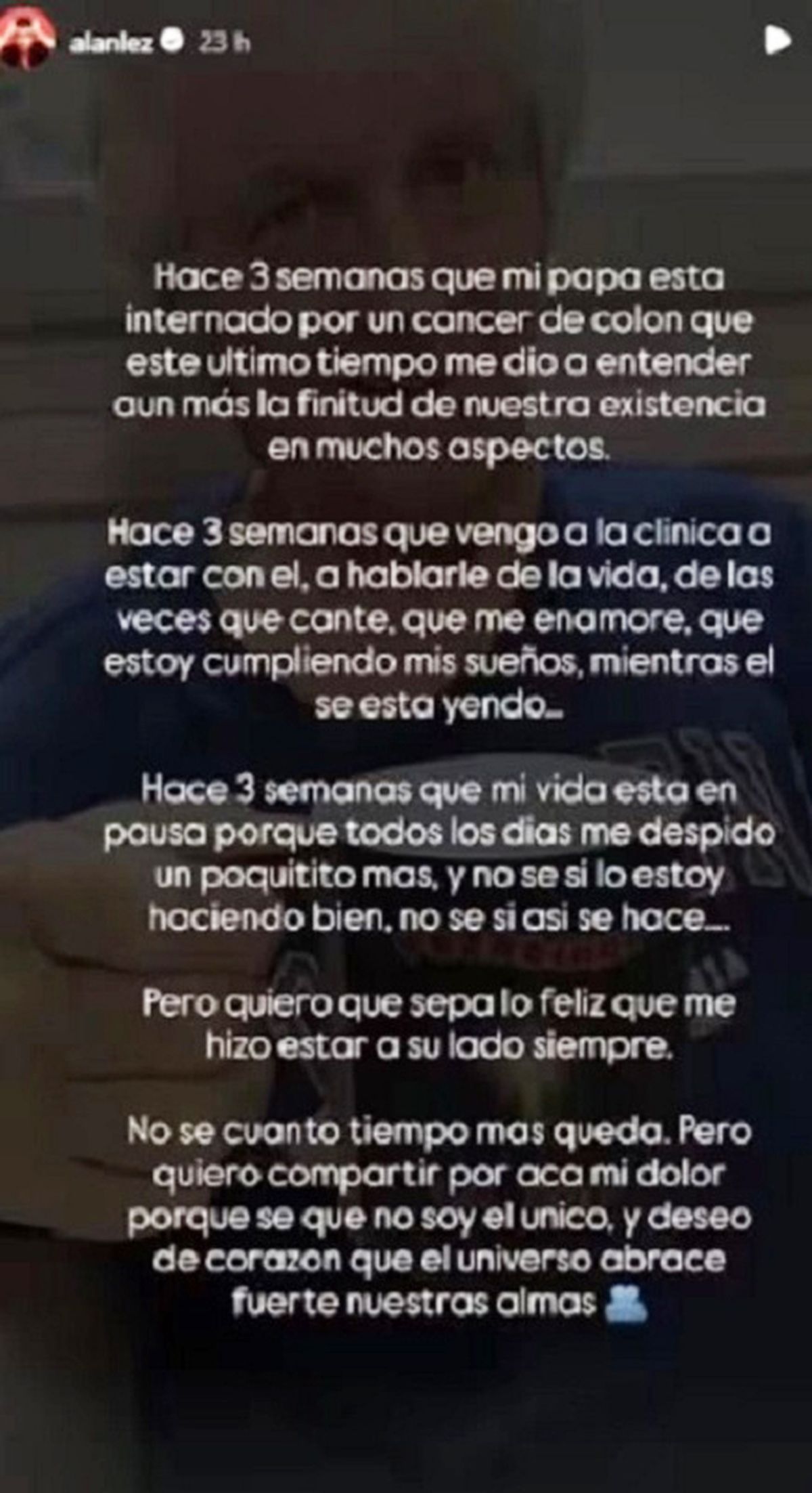 “Mi papá está internado por un cáncer de colon que en este último tiempo me dio a entender aún más la finitud de nuestra existencia en muchos aspectos”, comenzó el ex concursante del programa musical desde sus historias de Instagram.