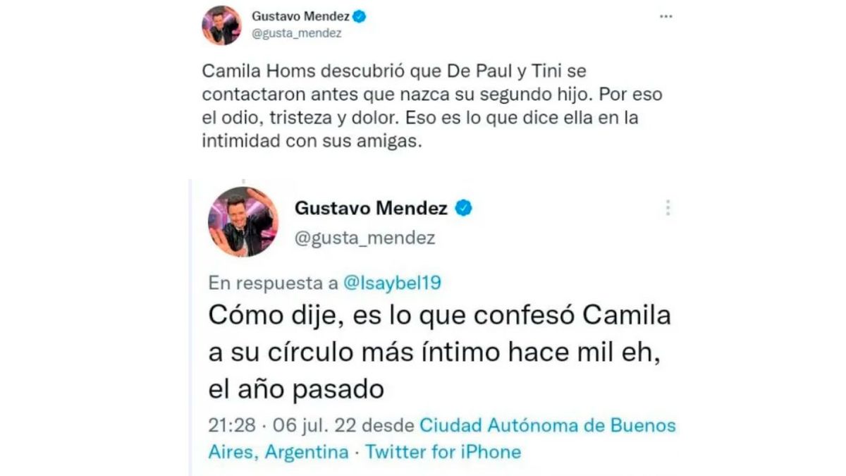 “Camila Homs descubrió que De Paul y Tini se contactaron antes que nazca su segundo hijo. Por eso el odio, tristeza y dolor. Eso es lo que dice ella en la intimidad con sus amigas”, indicó Méndez.