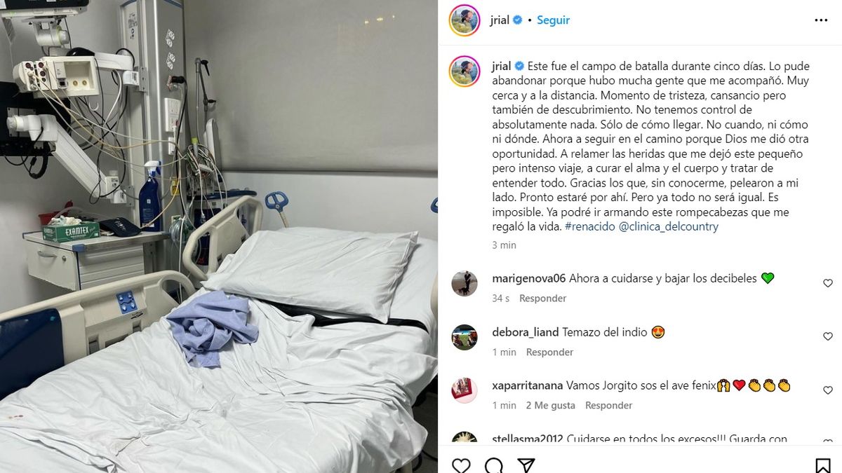 Y siguió profundo: "Ahora a seguir en el camino porque Dios me dio otra oportunidad. A relamer las heridas que me dejó este pequeño pero intenso viaje, a curar el alma y el cuerpo y tratar de entender todo. Gracias los que, sin conocerme, pelearon a mi lado. Pronto estaré por ahí. Pero ya todo no será igual. Es imposible. Ya podré ir armando este rompecabezas que me regaló la vida. #renacido @clinica_delcountry".