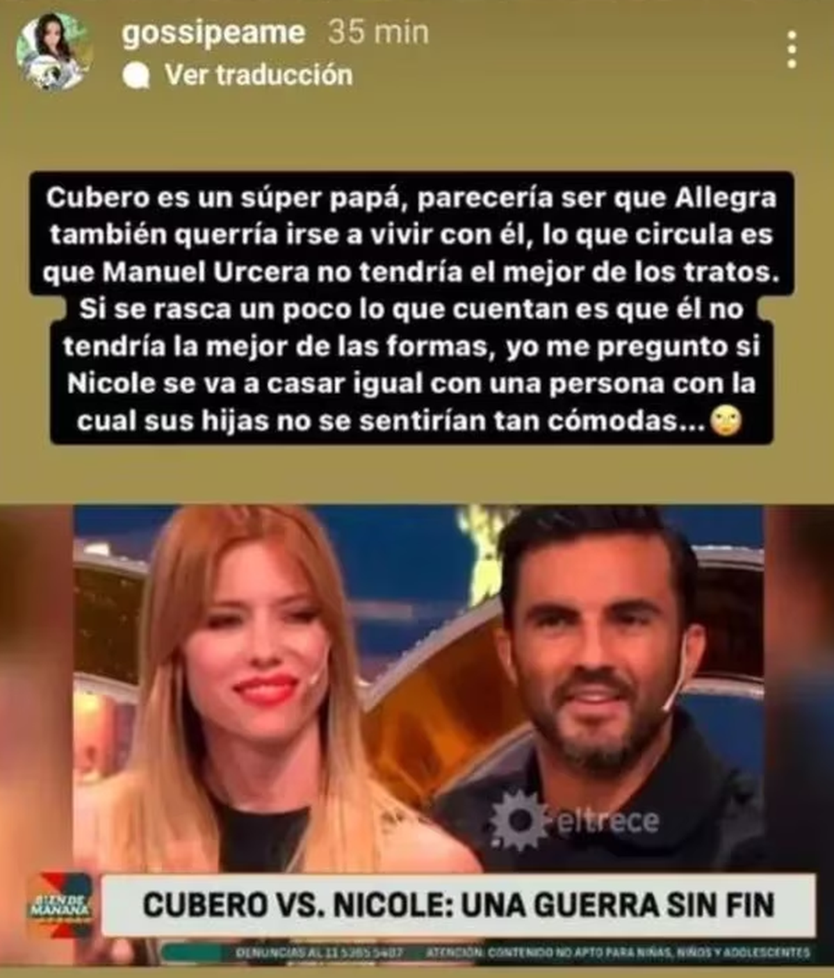 “Cubero es un súper papá. Parecería ser que Allegra también querría irse a vivir con él, lo que circula es que Manuel Urcera no tendría el mejor de los tratos”, comenzó contando la panelista de DDM, Pochi de Gossipeame, en su cuenta de Instagram, donde suele compartir diferentes aspectos de la farándula.