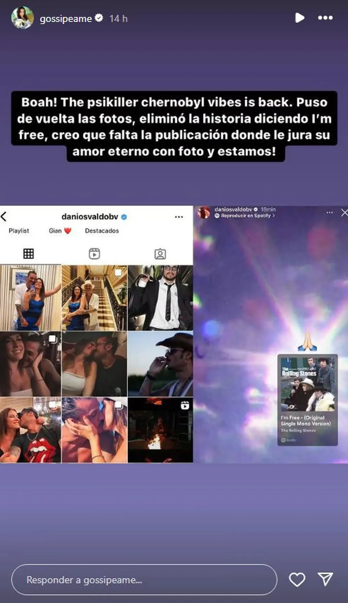 Más tarde, Pochi advirtió que Daniel Osvaldo volvió a hacer públicas las imágenes junto a Daniela Ballester. “Él puso de vuelta las fotos y eliminó la historia diciendo I’m free (soy libre). Creo que falta la publicación donde le jura su amor eterno con foto y estamos”, expresó.