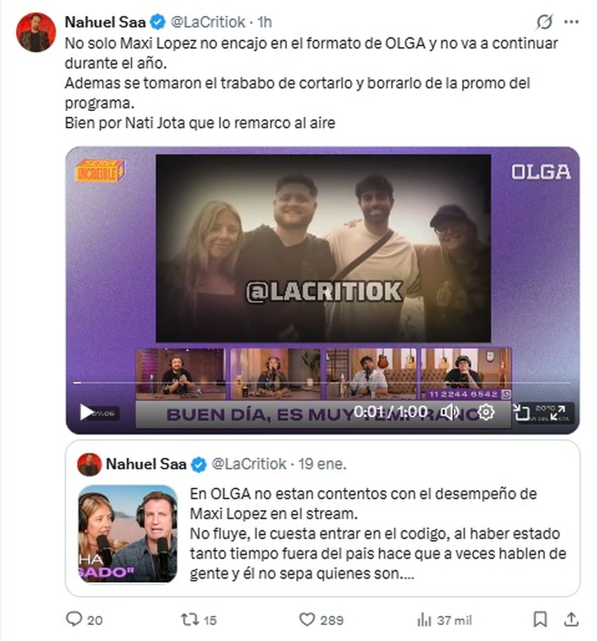 "No sólo Maxi López no encajó en el formato de OLGA y no va a continuar durante el año. Además se tomaron el trabajo de cortarlo y borrarlo de la promo del programa. Bien por Nati Jota que lo remarcó al aire", expuso en la red social X el periodista Nahuel Saa junto al video con el recorte del programa en el que hacen referencia a la salida del primer exmarido de Wanda Nara del programa.