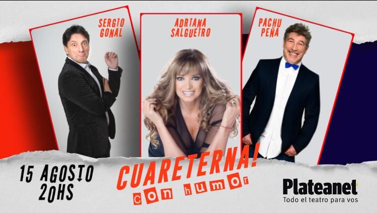 Sergio Gonal, Pachu Peña y Adriana Salgueiro quieren pasar la noche del sábado con vos asi que..… ¡Quedate en casa! cumpliendo con todos los cuidados, para disfrutar de la “CUARETERNA CON HUMOR” a las 20hs por streaming.