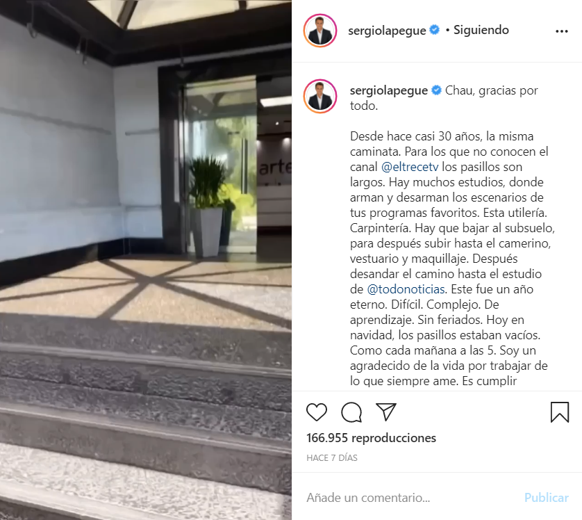 En su cuenta de Instagram, declaró: "Chau, gracias por todo. Desde hace casi 30 años, la misma caminata. Para los que no conocen el canal @eltrecetv los pasillos son largos. Hay muchos estudios, donde arman y desarman los escenarios de tus programas favoritos. Esta utilería. Carpintería. Hay que bajar al subsuelo, para después subir hasta el camerino, vestuario y maquillaje. Después desandar el camino hasta el estudio de @todonoticias. Este fue un año eterno. Difícil. Complejo. De aprendizaje. Sin feriados. Hoy en navidad, los pasillos estaban vacíos. Como cada mañana a las 5. Soy un agradecido de la vida por trabajar de lo que siempre ame. Es cumplir sueños cada día. Allá a lo lejos me veo entrando como asistente de producción. Con la misma pasión que ahora. Orgulloso de mi camino lento pero firme. Necesitamos parar un poco, bajar un cambio. Llevar la máquina a boxes para seguir la carrera. La meta cada vez está más cerca. Entro en vacaciones, gracias de corazón por cada mensaje cariñoso. Los quiero!!!!".