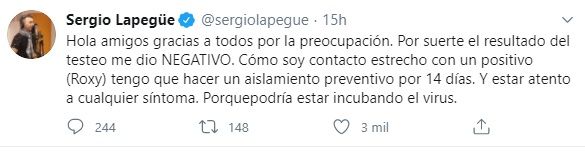 En tanto, el domingo el conductor recibió el resultado del estudio y lo comunicó al instante: "Hola amigos gracias a todos por la preocupación. Por suerte el resultado del testeo me dio NEGATIVO. Cómo soy contacto estrecho con un positivo (Roxy) tengo que hacer un aislamiento preventivo por 14 días. Y estar atento a cualquier síntoma. Porque podría estar incubando el virus".