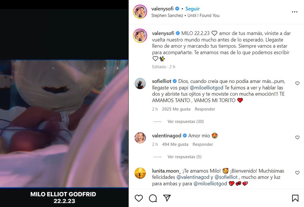 "Milo. 22.2.23. Amor de tus mamás, viniste a dar vuelta nuestro mundo mucho antes de lo esperado", indicaron en el feed con la primera imagen del bebé.