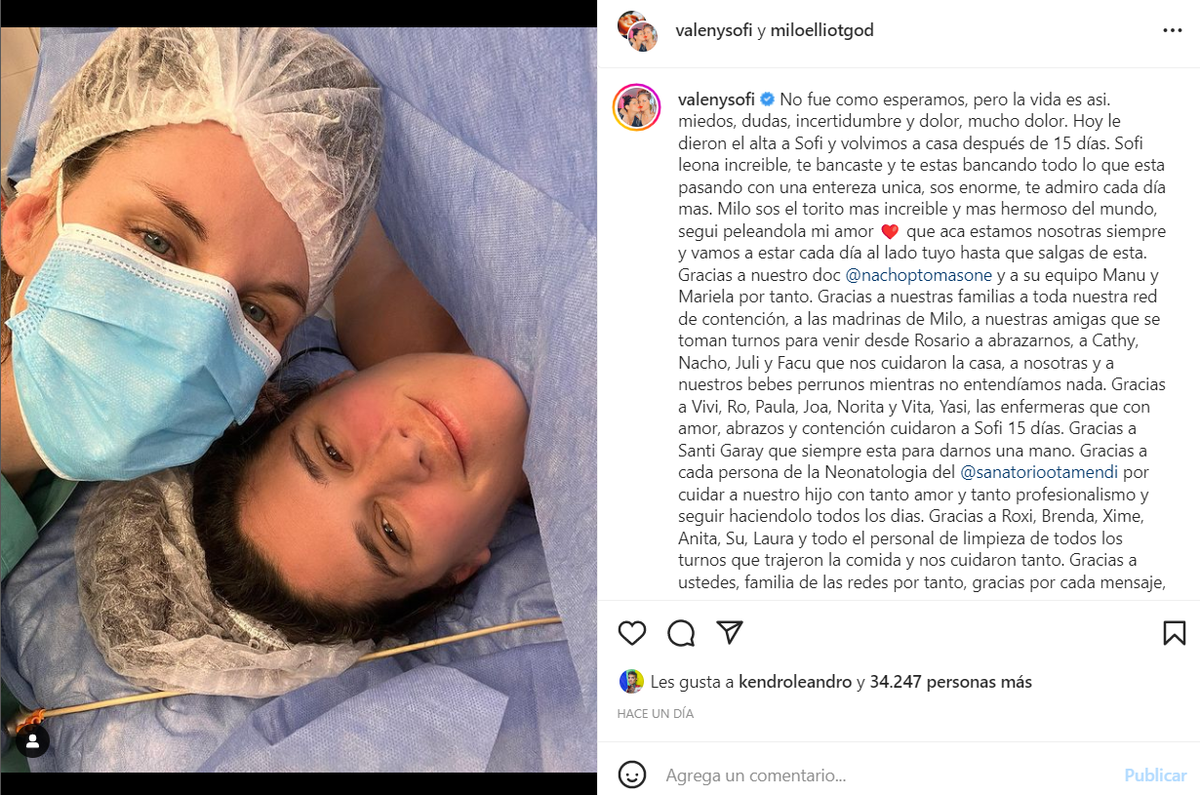 En un posteo en las redes, las actrices hablaron sobre este duro presente. "No fue como esperamos, pero la vida es así. Miedos, dudas, incertidumbre y dolor, mucho dolor. Hoy le dieron el alta a Sofi y volvimos a casa después de 15 días. Sofi, leona increíble, te bancaste y te estás bancando todo lo que esta pasando con una entereza única. Sos enorme, te admiro cada día mas", expresó Valentina en su Instagram.