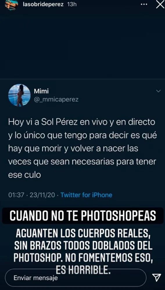 “Hoy vi a Sol Pérez en vivo y en directo y lo único que tengo para decir es que hay que morir y volver a nacer las veces que sean necesarias para tener ese culo”, expresó una usuaria.