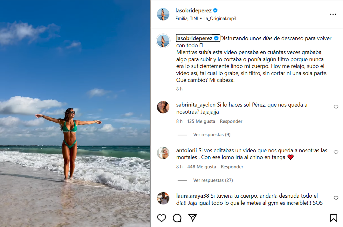 "Disfrutando de unos días de descanso para volver con todo. Mientras subía este video pensaba en cuantas veces grababa algo para subir y lo cortaba o ponía algún filtro porque nunca era lo suficientemente lindo mi cuerpo", comenzó escribiendo.