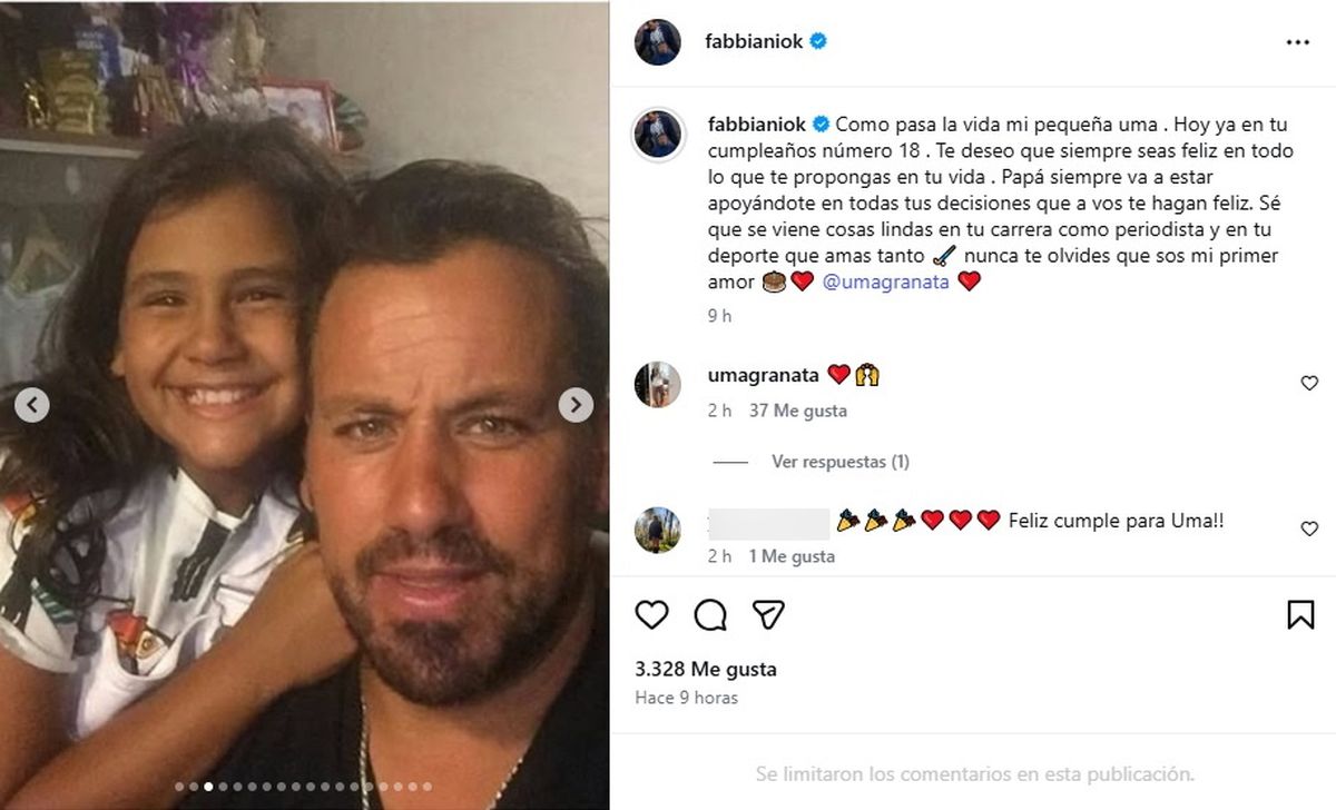 En ese contexto especial, y coincidiendo con una fecha más que significativa —el cumpleaños número 18 de la adolescente—, por estas horas el exfutbolista decidió expresarle públicamente todo su amor con un mensaje cargado de emoción en sus redes sociales, sumándose así a los festejos. “Cómo pasa la vida, mi pequeña Uma. Te deseo que siempre seas feliz en todo lo que te propongas. Papá siempre va a estar apoyándote en cada decisión que te haga bien. Sé que se vienen cosas lindas en tu carrera como periodista y en tu deporte. Nunca te olvides que sos mi primer amor”, escribió, dejando en evidencia el fuerte vínculo que hoy los une.