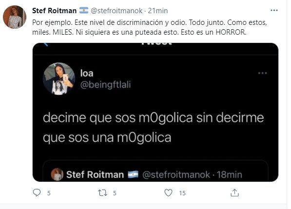 Tras compartir ese mensaje, Stefi recibió numerosas críticas y hasta insultos, los cuales ella compartió algunos y arrojó: "El nivel de odio en esta red es asqueroso".
