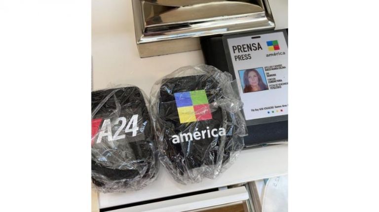 “Celina Rucci contratada por América como corresponsal desde New York”, informó el periodista en Twitter junto a una foto del carnet de prensa de Celina al lado de los dos capuchones de micrófono pertenecientes a los canales del grupo de medios donde trabajará América y A24.