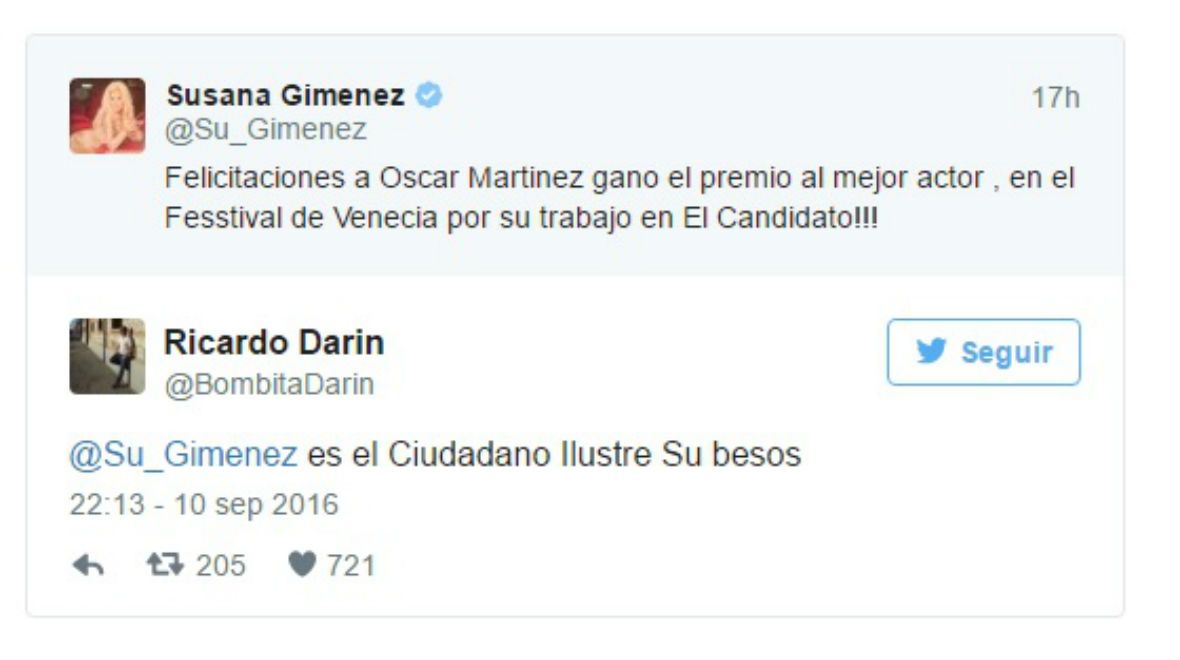 Susana Giménez utilizó las redes sociales para felicitar a Martínez por el premio pero se equivocó a la hora de hacer mención a la película en la que se destacó.