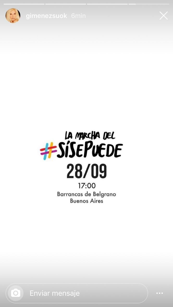 Y este viernes, Susana se sumó a la convocatoria para la marcha en apoyo a Macri que se realizará este sábado en Belgrano. A través de su cuenta de Instagram, compartió la invitación bajo el hashtag #SiSePuede.