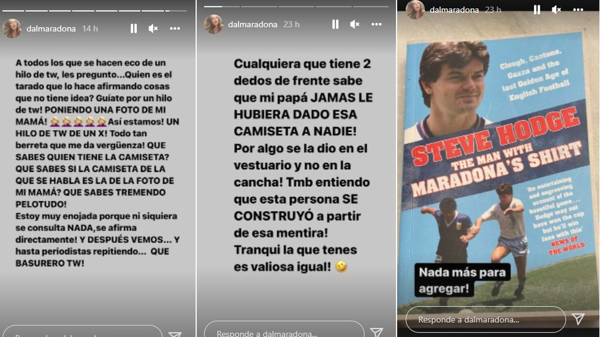 Y luego agregó furiosa en otras historias: "Cualquiera que tiene dos dedos de frente sabe que mi papá jamás le hubiera dado esa camiseta a nadie!".
