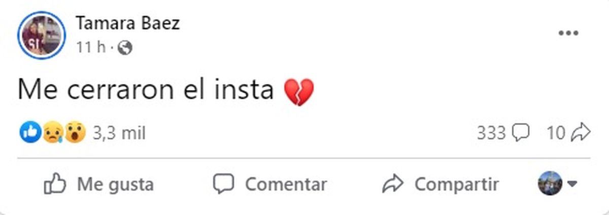 Lo cierto es que desde hace algunas horas la cuenta @tamibaez429 fue cerrada, y no precisamente por la propia Tamara. Es por eso que la bailarina atinó a avisarle a su fandom desde su Facebook, su otra red social. “Me cerraron el insta”, anunció, junto a un emoji de un corazón roto rojo.