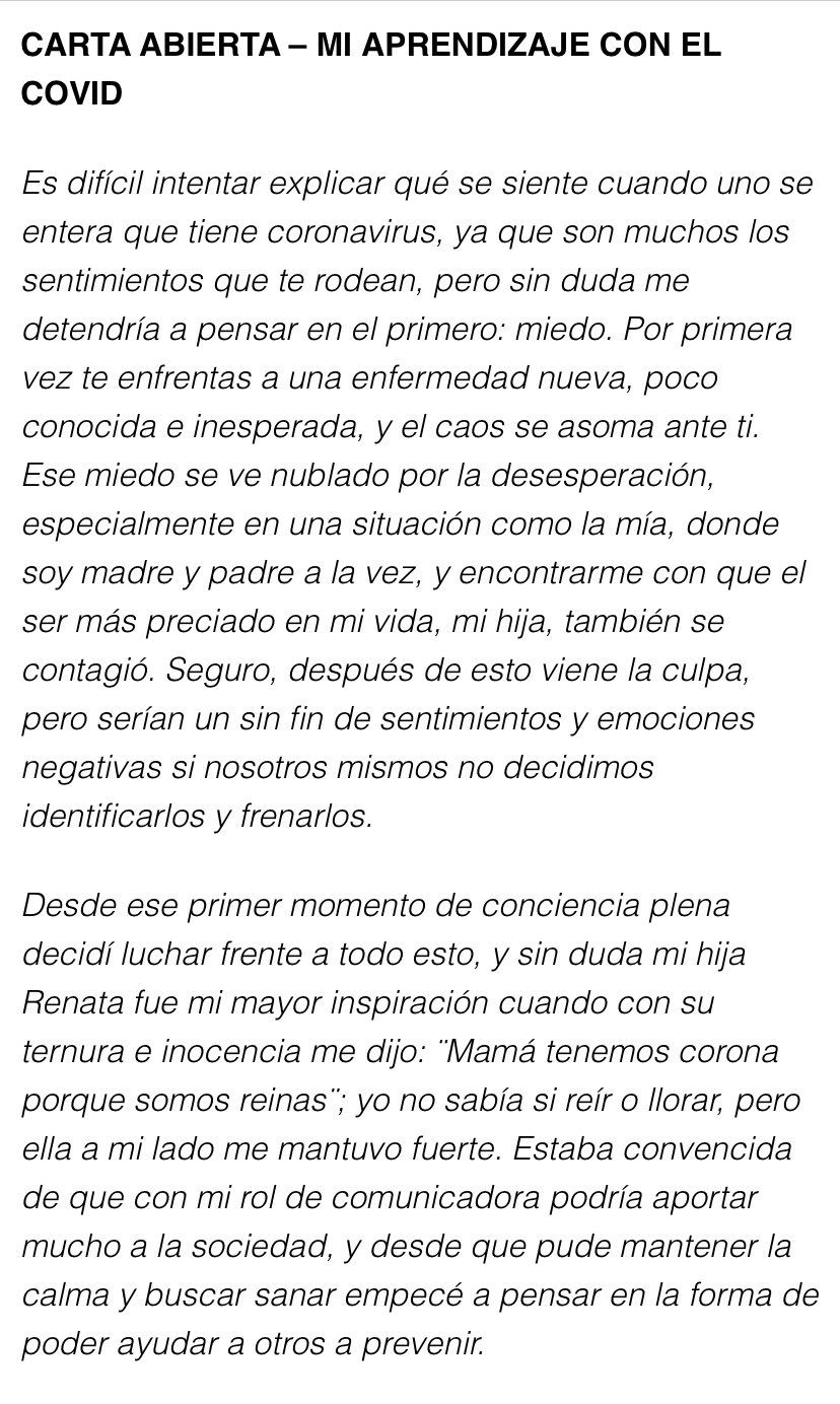 "Es difícil intentar explicar qué se siente cuando uno se entera que tiene coronavirus, ya que son muchos los sentimientos que te rodean, pero sin duda me detendría a pensar primero: miedo. Por primera vez te enfrentas a una enfermedad nueva, poco conocida e inesperada, y el caos se asoma ante ti. Ese miedo se ve nublado por la desesperación, especialmente en una situación como la mía, donde soy madre y padre a la vez, y encontrarme con que el ser más preciado de mi vida, mi hija, también se contagió. Seguro, después de esto viene la culpa, pero serían un sin fin de sentimientos y emociones negativas si nosotros mismos no decidimos identificarlos y frenarlos", inició su relato.