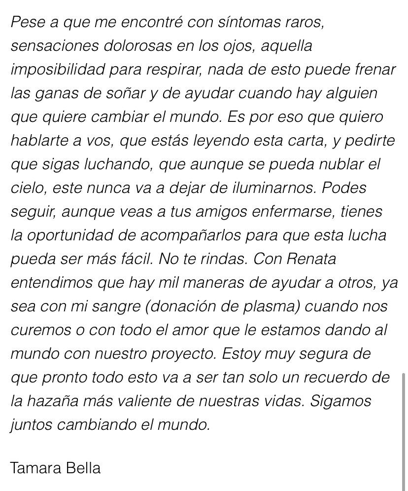 "Pese a que me encontré con síntomas raros, sensaciones dolorosas en los ojos, aquella imposibilidad para respirar, nada de esto puede frenar las ganas de soñar y de ayudar cuando hay alguien que quiere cambiar el mundo. Es por eso que quiero hablarte a vos, que estas leyendo esta carta, y pedirte que sigas luchando, que aunque se pueda nublar el cielo, este nunca va a dejar de iluminarnos. Podes seguir, aunque veas a tus amigos enfermarse, tiene la oportunidad de acompañarnos para que esta lucha pueda ser más fácil. No te rindas. Con Renata entendimos que hay mil maneras de ayudar a otros, ya sea con mi sangre (donación de plasma) cuando nos curemos o con todo el amor que le estamos dando al mundo con nuestro proyecto. Estoy muy segura de que pronto todo esto va a ser tan solo un recuerdo de la hazaña más valiente de nuestras vidas. Sigamos juntos cambiando el mundo", concluyó.