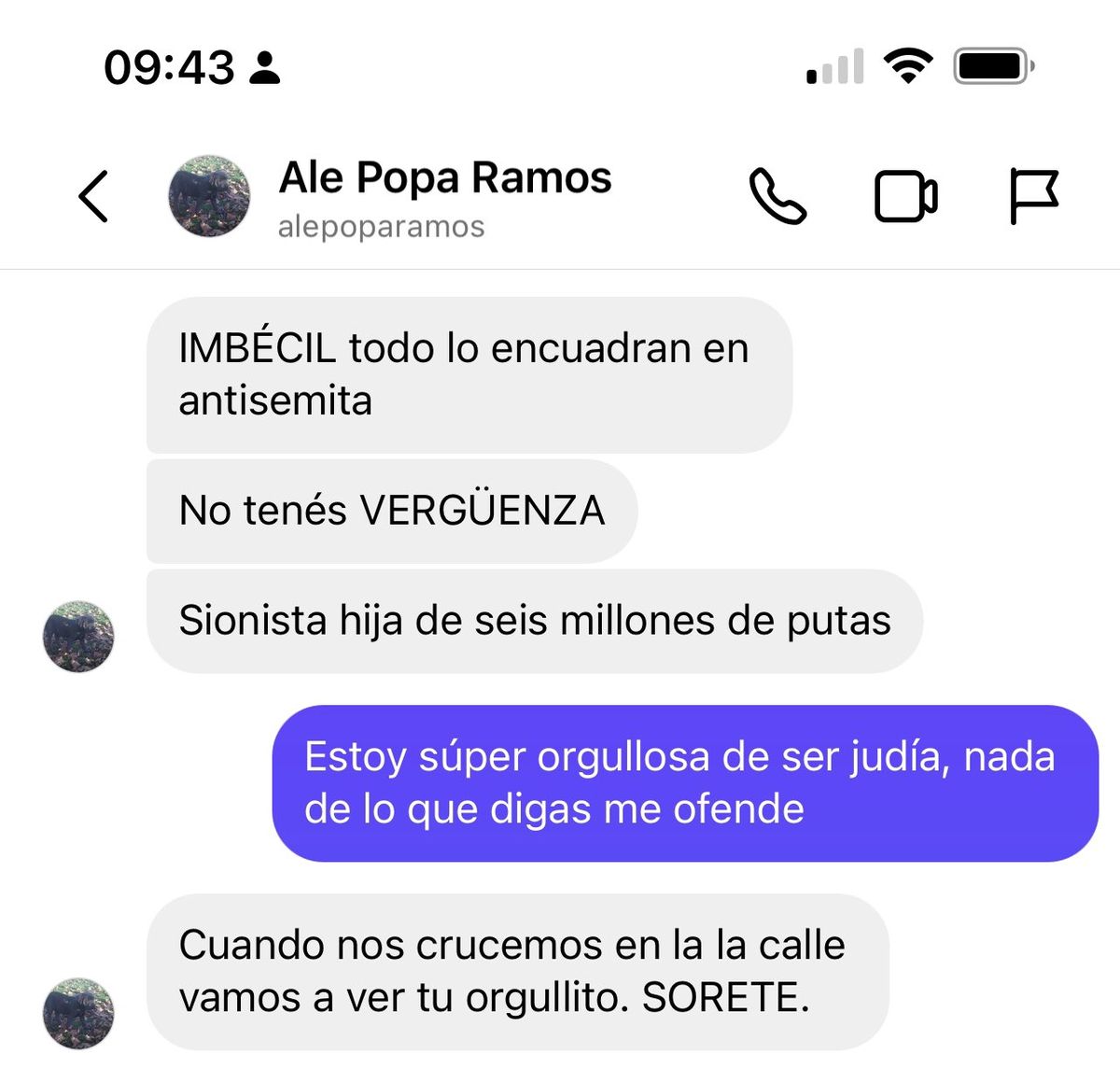 “Imbécil, todo lo encuadran en antisemita. No tenés vergüenza. Sionista hija de seis millones de put...”, decía el repudiable mensaje que recibió la periodista. Y ella le respondió: “Estoy súper orgullosa de ser judía. Nada de lo que digas me ofende”. A lo que la persona discriminadora contestó con un comentario amenazante: “Cuando nos crucemos en la calle vamos a ver tu orgullo. Sor...”.