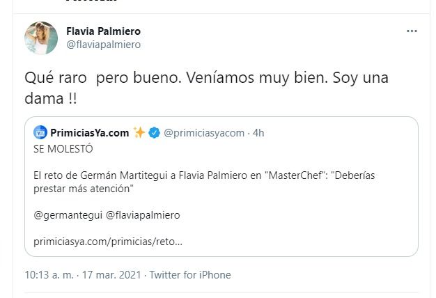 "Señor @germantegui le tengo respeto ,no creo q lo de ayer haya sido con mala onda. Ud sabe que me tomo muy en serio esto. Aprendo y estudio. Reponsabilidad. Trabajo y soy una señora ! El reto de colegio estuvo de más pero son cosas que pasan en las grabaciones ! @MasterChefAR", posteó.