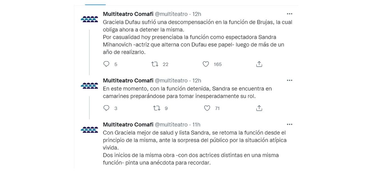"Con Graciela mejor de salud y lista Sandra, se retoma la función desde el principio de la misma, ante la sorpresa del público por la situación atípica vivida. Dos inicios de la misma obra -con dos actrices distintas en una misma función- pinta una anécdota para recordar", cerró el mensaje.