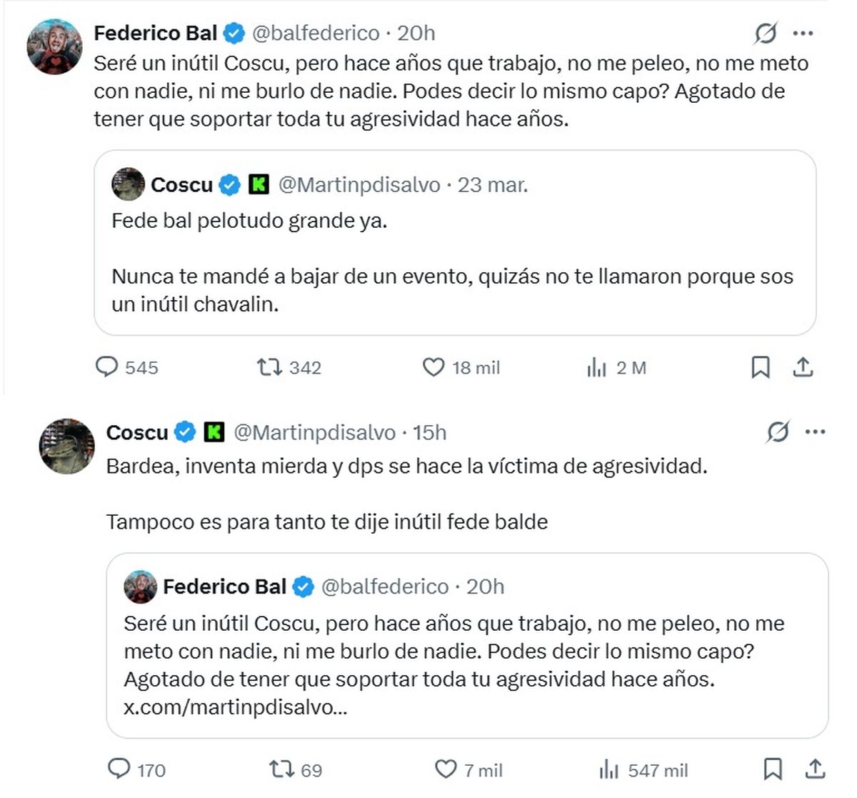 La discusión fue escalando en el nivel de tensión y se dijeron de todo: "Fede Bal pelotudo grande ya. Nunca te mandé a bajar de un evento, quizás no te llamaron porque sos un inútil chavalin. Me doy cuenta que independiente de la edad que tenga, este es mi Twitter y subo lo que se me cante el orto. Si me bardea fede bal en una nota con una mentira, primero me río, después lo puteo", arremetió Coscu.