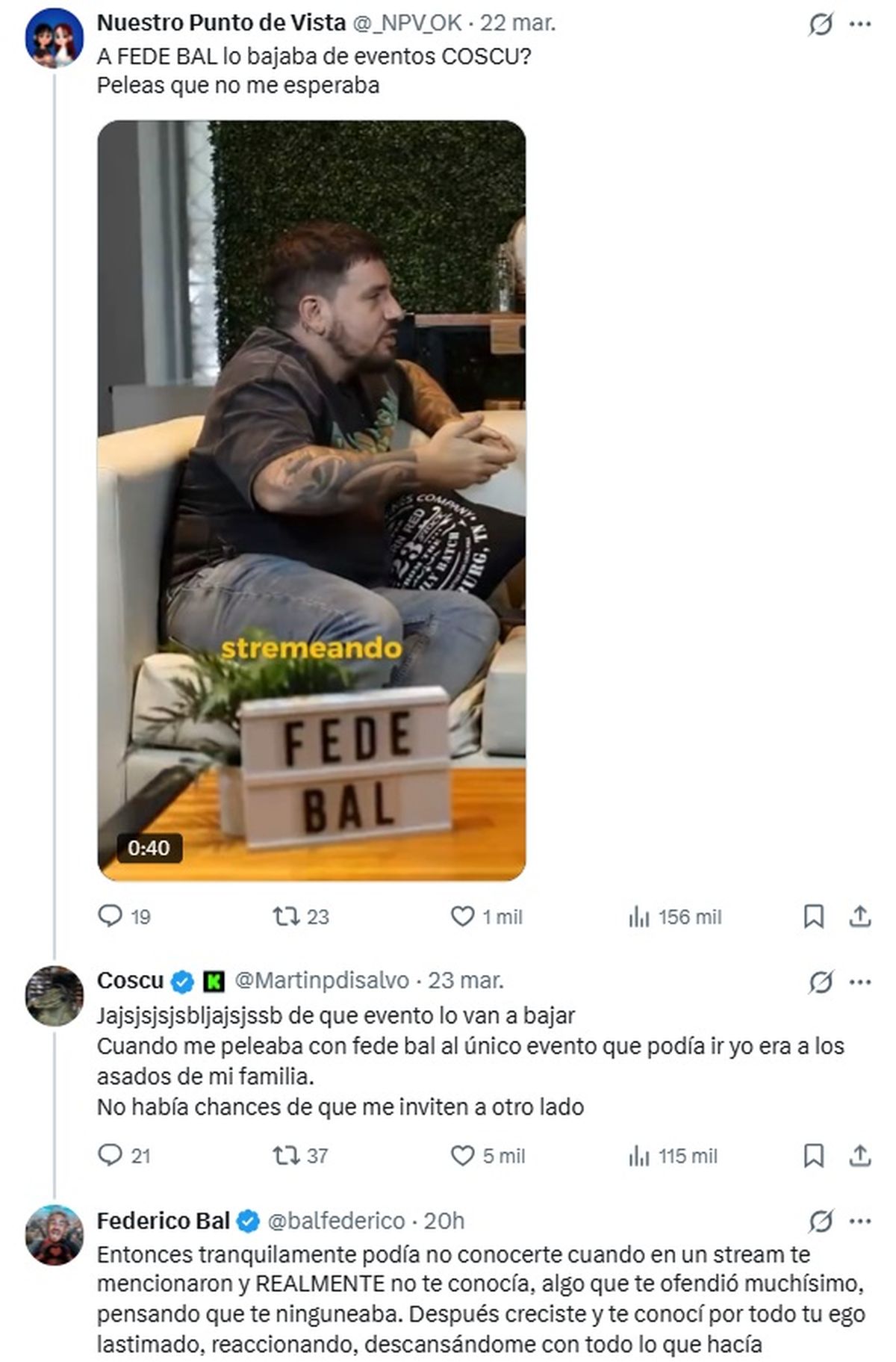 "No tengo relación con Coscu, nunca la tuve, él se enojó. Estaba jugando un juego porque me gustaba jugar con mis amigos y me decían 'tenés que streamear con Coscu'. Leí rápido y yo no sabía quién era, pero no es que lo ningunee ni nada, él pensó que sí. Dije 'Coscu, Casqui, no sé quién era'. A él le llegó el recorte y se enojó un montón", comentó Fede Bal.