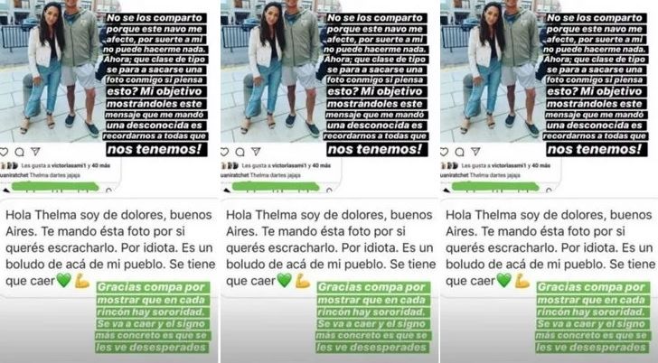 "No se los comparto porque este nabo me afecte, por suerte a mi no puede hacerme nada. Ahora; ¿qué clase de tipo se para a sacarse una foto conmigo si piensa esto?. ¡Mi objetivo mostrándoles este mensaje que me mandó una desconocida es recordarnos a todas que nos tenemos! Gracias compa por mostrar que en cada rincón hay sororidad. Se va a caer y el signo más concreto es que se les ve desesperades", expresó la actriz.
