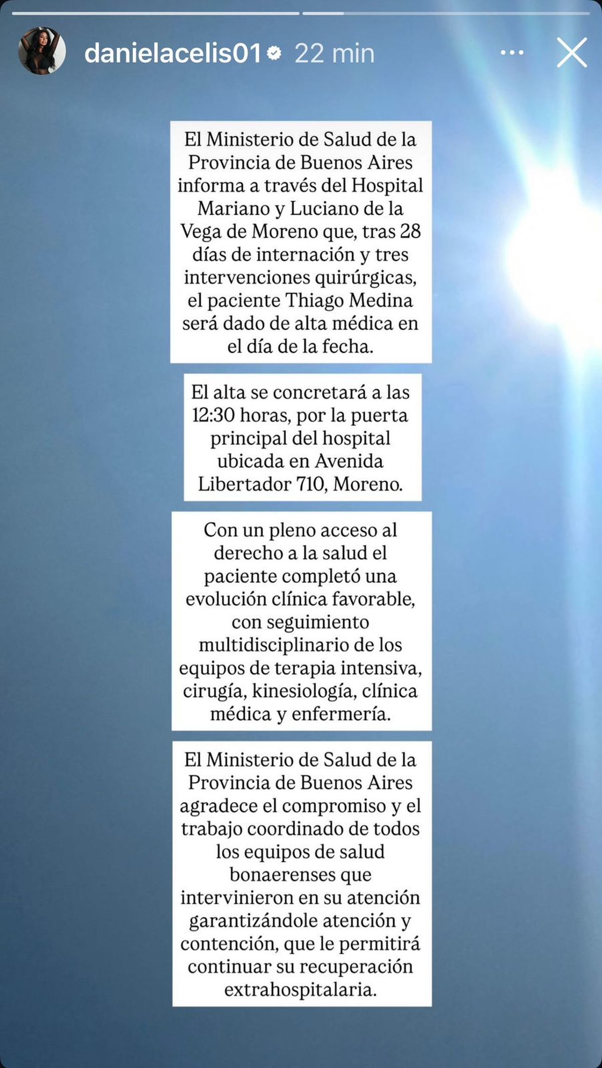 "El Ministerio de Salud de la Provincia de Buenos Aires agradece el compromiso y el trabajo coordinado de todos los equipos de salud bonaerenses que intervinieron en su atención garantizándole atención y contención, que le permitirá continuar su recuperación extrahospitalaria", concluye así la información que Daniela Celis y toda la familia de Thiago recibió por parte de la institución médica respaldada por el Ministerio de Salud provincial, y que la morocha no dudó en compartir en sus redes a modo de agradecimiento a todos aquellos que no dejaron de rezar y pedir por la recuperación de su ¿expareja?.