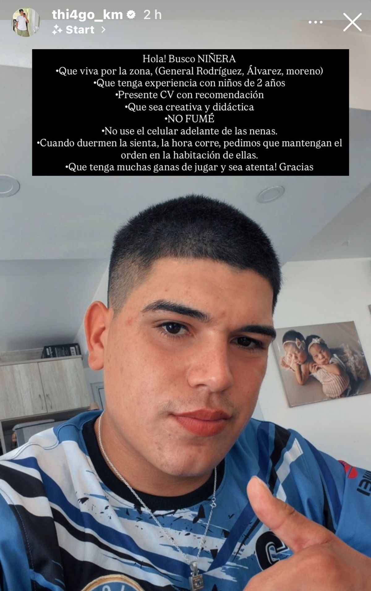 El aviso fue publicado por el propio Thiago en sus historias de Instagram. Allí aclaró que la persona interesada debía vivir en zonas cercanas como General Rodríguez, Francisco Álvarez o Moreno. Hasta ahí, todo parecía un pedido habitual. Sin embargo, lo que realmente encendió el debate fue la lista de requisitos que acompañó el mensaje.