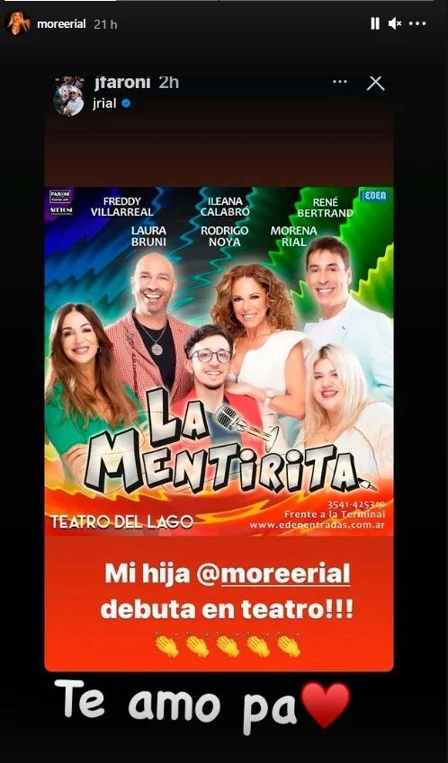 "Mi hija @moreerial debuta en teatro", escribió Jorge Rial, junto a varios emojis de aplausos. Y Morena reaccionó con una significativa respuesta, que dejaría entrever que entre ellos está todo bien nuevamente. "Te amo, pa", manifestó la joven, al repostear la historia de su padre.