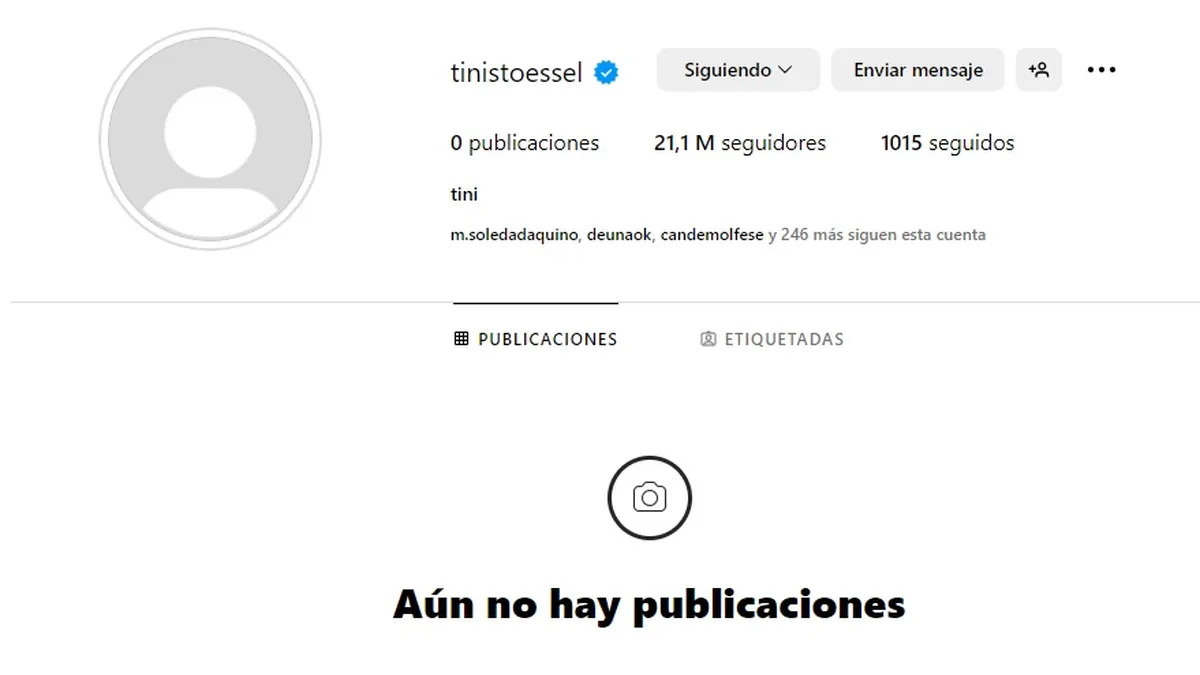 Lo cierto es que Stoessel tiene más de 21 millones de seguidores, por lo que fue cuestión de un par de minutos para que se viralizase el apagón virtual de Tini, al borrar todo el material que tenía publicado en su feed. Si bien no faltaron memes sobre la cuestión, mientras que algunos fans se preocuparon otros lo tomaron como una clara señal de algún nuevo material musical próximo a lanzar.