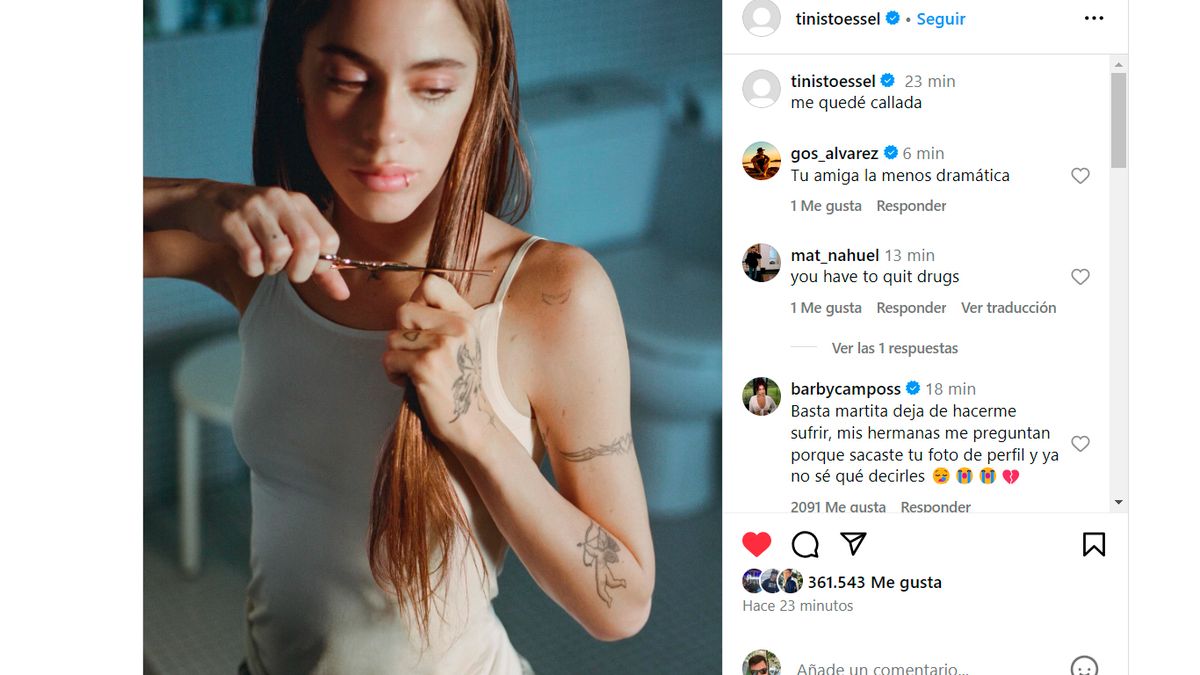 En tanto, recientemente Tini había contado precisamente por esa vía que estaba un proceso de "cambios" y que sus modificaciones en el look reflejaban sus "varios procesos emocionales" que vivió en los últimos meses, sobre todo luego de su separación de Rodrigo de Paul.