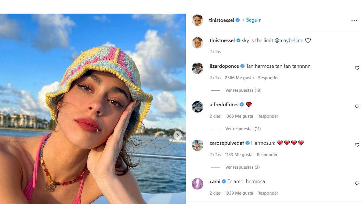 Si bien fue lo bastante cuidadosa para mostrarse sin la compañía de Rodrigo de Paul, siendo él quizás el exclusivo fotógrafo, Tini Stoessel posó sensual con un traje de baño de dos piezas color rosa, y con un gorrito tejido al tono en los colores rosa, celeste y amarillo pastel, despertando más de 1 millón de likes en unas pocas horas. Lo que se dice, una verdadera diosa.