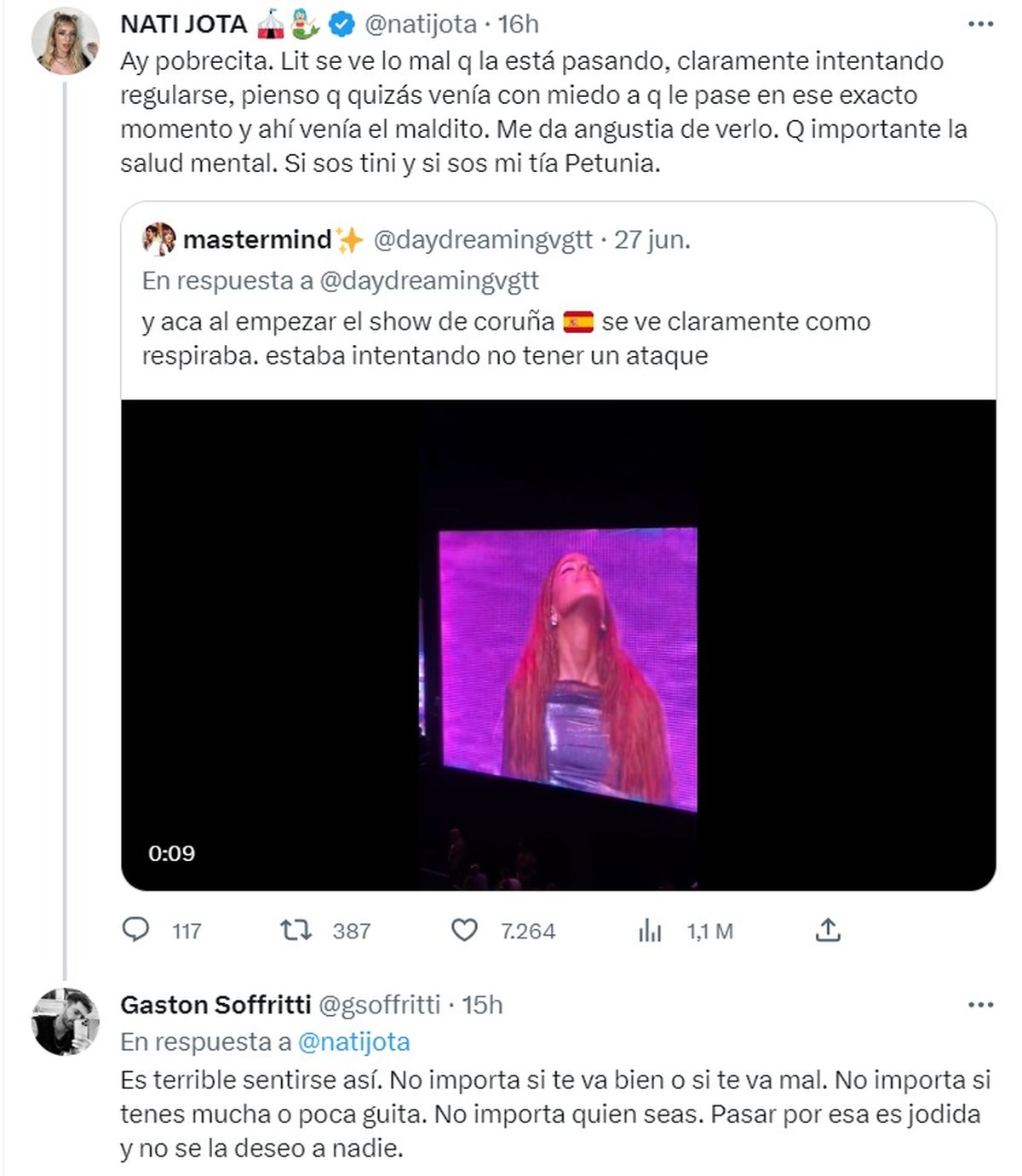 "Ay pobrecita. Lit se ve lo mal que la está pasando, claramente intentando regularse, pienso que quizás venía con miedo a que le pase en ese exacto momento y ahí venía el maldito. Me da angustia de verlo. Qué importante la salud mental. Si sos Tini y si sos mi tía Petunia", comentó Nati Jota en Twitter.