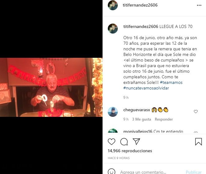 "Llegué a los 70. Otro 16 de junio, otro año más, ya son 70 años, para esperar las 12 de la noche me puse la remera que tenia en Belo Horizonte el día que Sole me dio se vino a Brasil para que no estuviera solo otro 16 de junio, fue el último cumpleaños juntos. Como te extrañamos Sole!!!", expresó conmovido Tití en Instagram.